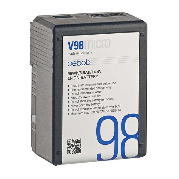 BATTERIE BEBOB V98 MICRO 14.4V Points forts de la batterie BATTERIE BEBOB V98 MICRO 14.4V Puissance 14.4V, 10.0Ah, 43Wh Montage direct sur une caméra via V-Mount Indicateur d’alimentation DEL à 5 niveaux (100% – 80% – 60% – 40% – 20%) Résiste à une chute allant jusqu’à 1,5m Twist D-TAP et USB Compatible avec les caméras RED, SONY, ARRI Une fois hors d’usages, reprise par le fabricant, à moitié prix d’une nouvelle batterie Port USB pour charger des appareils mobiles ( smartphone, tablette) Respecte la réglementation en vigueur Lampe de poche intégrée