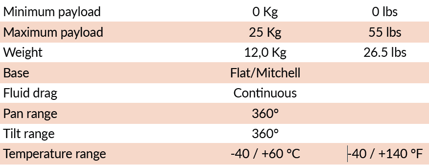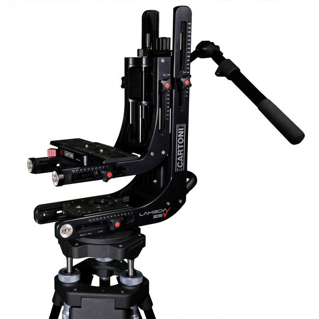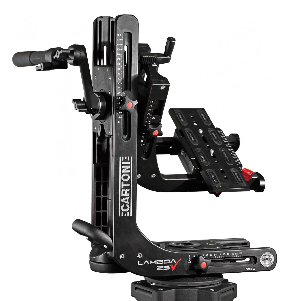 Représente la solution idéale pour les caméras pesant jusqu'à 25 Kg (55 lbs). La Lambda 25 hérite de toutes les fonctions d'une Lambda classique avec l'addi sur le Pan & Tilt et les axes de rotations sont percés pour permettre le passage de câbles et ainsi n'imposer aucune limite aux multiples rotations à 360°. Le système breveté CARTONI de modules fluides à variation est continue sur les deux axes. La tête Lambda 25 peut être montée sur tous les supports classiques tels que trépied, chariots, en position rigide de grue ou bien sur des bras Jibs.