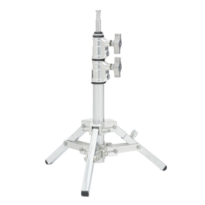 Max Height: 36" (914mm) Min Height: 20" (508mm) Capacity: 22lbs (10kg) Weight: 5.75lbs (3kg) Footprint: 14" (356mm) Folded Base: 5" (127mm) Heavy-duty and rugged, these aluminum and steel stands can withstand the rigors of location shooting.